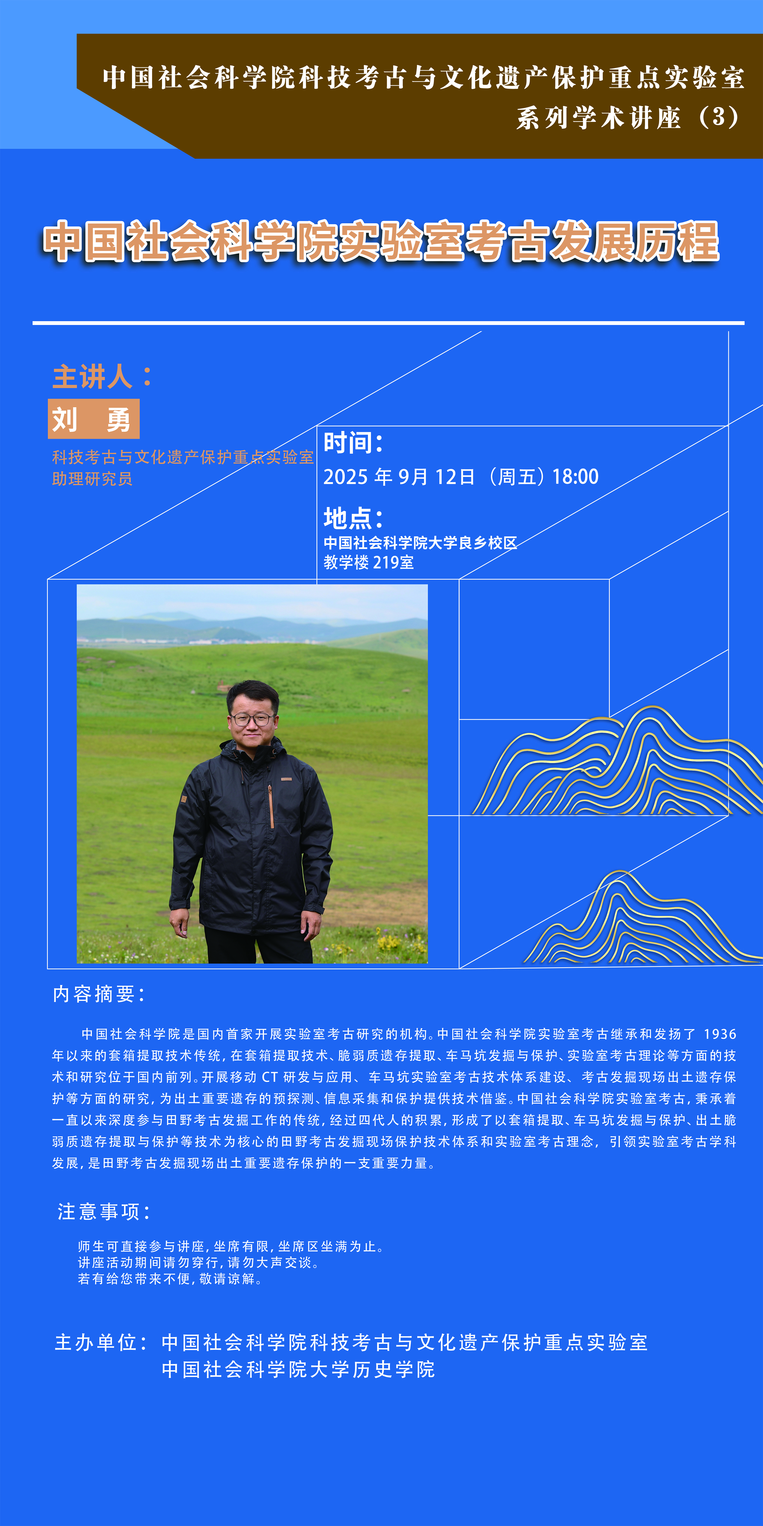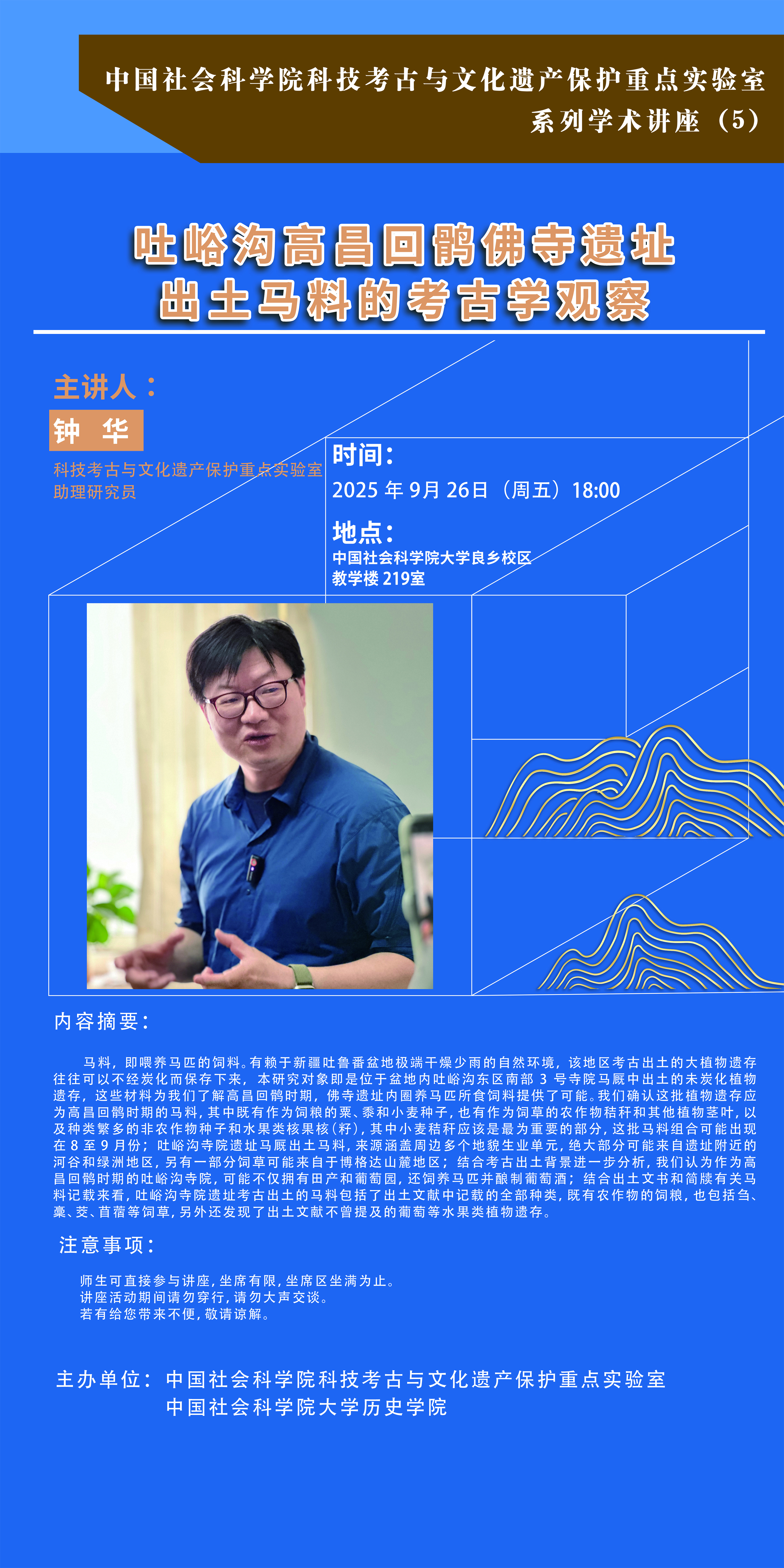 科技考古与文物保护功在当代、利在千秋。本系列讲座旨在搭建多学科交叉融合的学术平台,聚焦中华文明起源、统一多民族国家形成与发展等重大课题,让更多文物和文化遗产活起来,挖掘其多重价值,助力构建具有中国特色、中国风格、中国气派的考古学,同时发挥知古鉴今、资政育人的作用。