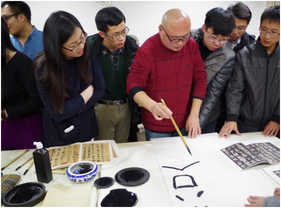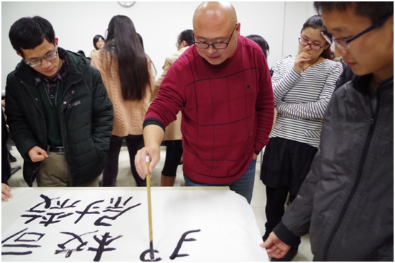 初冬北京的夜晚寒风萧瑟、雨雪霏霏,而教学楼106教室却济济一堂、暖意融融,中国社科院研究生院文博中心2015级党支部于2015年11月19日举办的“笔酣墨饱·妙在心手”刘宏宇先生书法交流会吸引了小院里的数十位书法爱好者,他们来自不同系所,齐聚这一间小小的教室,一起交流研习书法艺术的心得体会。