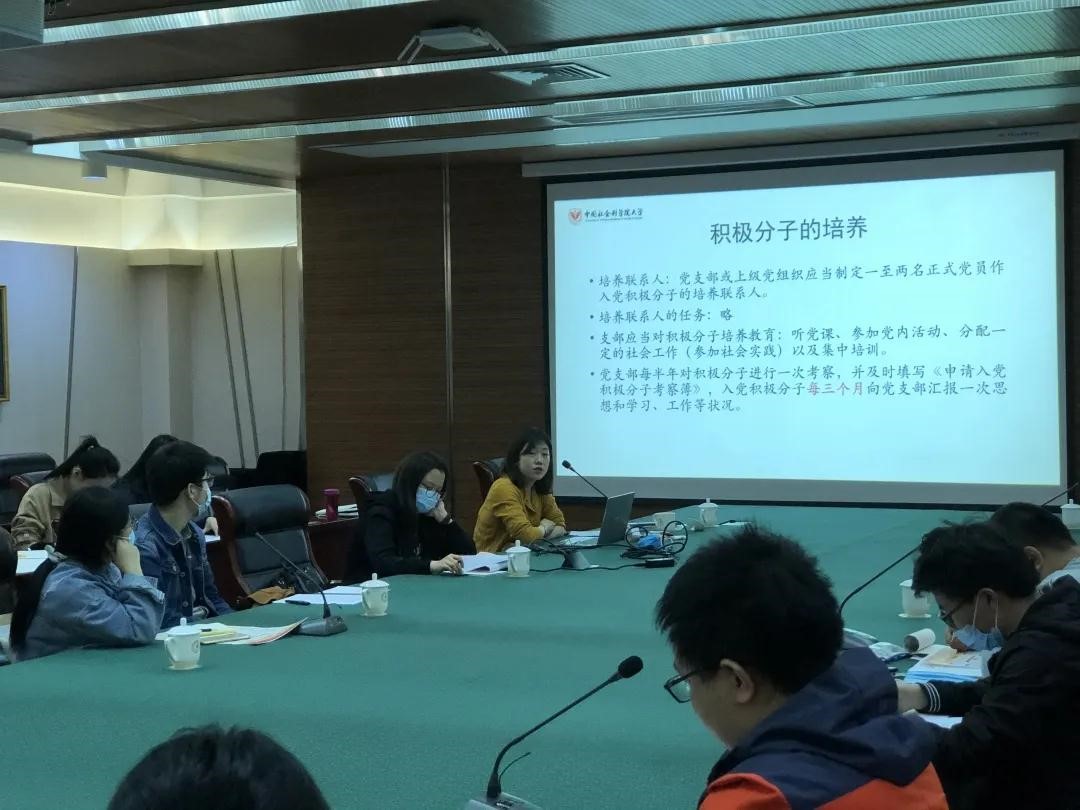而后,董慧子老师针对党支部工作中的党员发展和支部建设两项工作进行了培训。她从党员发展的相关文件入手,带领大家细致梳理了党员发展工作的流程以及各个环节所对应的文书写作以及需要注意的问题并对一些常见问题进行了解答。在谈到支部建设时,她强调各个支部应严格执行“三会一课”制度,过好组织生活,办好主题党日活动,积极开展批评与自我批评。在发展党员时应严格按照成熟一个发展一个的原则,重视党员发展质量,严把党员发展入口关。