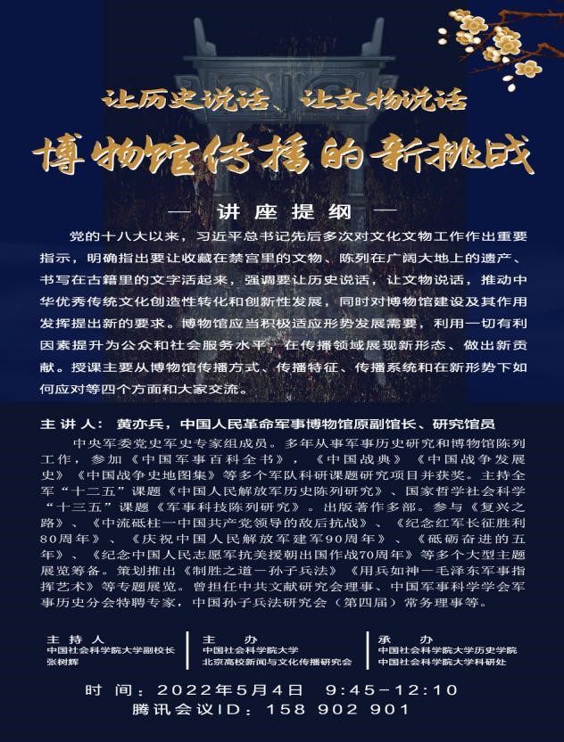 2022年5月4日上午,中国人民革命军事博物馆原副馆长黄亦兵研究馆员为社科大师生带来了题为“让历史说话、让文物说话:博物馆传播的新挑战”的精彩在线讲座。讲座由社科大副校长、北京高校新闻与文化传播研究会理事长张树辉主持,来自校内外的近200名师生以云端方式聆听讲座。