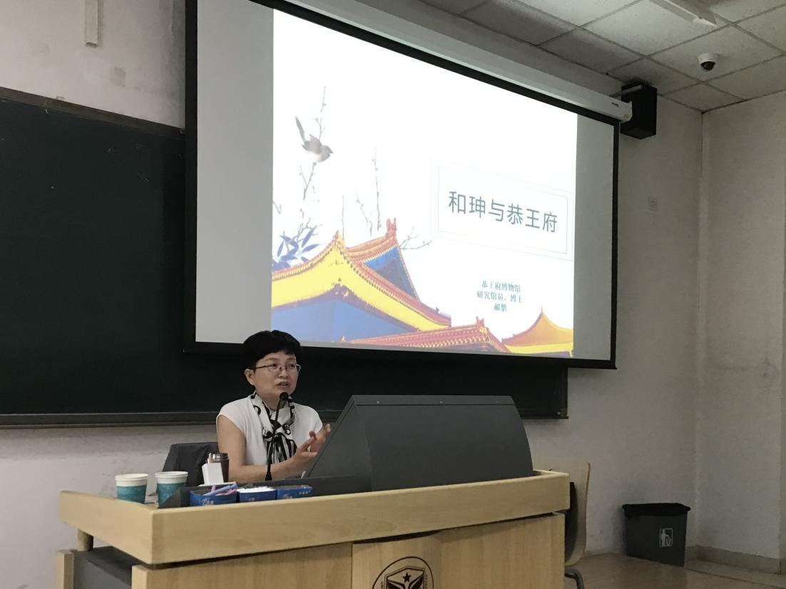 2021年5月11日下午 ,恭王府郝黎研究馆员应邀在我校研教楼121教室为2020级文博专硕带来了题为“和珅与恭王府”的专题讲座,文博专硕全体同学参加。