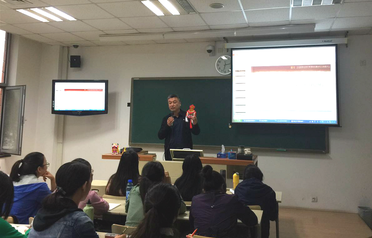 孙主任首先对恭王府的历史沿革、建筑特点、文化内涵等做了生动介绍。讲座中,孙主任现场向同学们展示了精致的中国传统手工艺品,并结合各种非物质文化遗产图片和传统技艺视频进行详细解说,为同学们解析中国非物质文化遗产保护与传统技艺项目的分类标准。随后,孙主任介绍了恭王府在中国非物质文化遗产生产性保护系列项目(传统技艺、传统美术、传统中医药类)中的多项工作和成果,与同学们一起探讨非物质文化遗产的传承与发展。